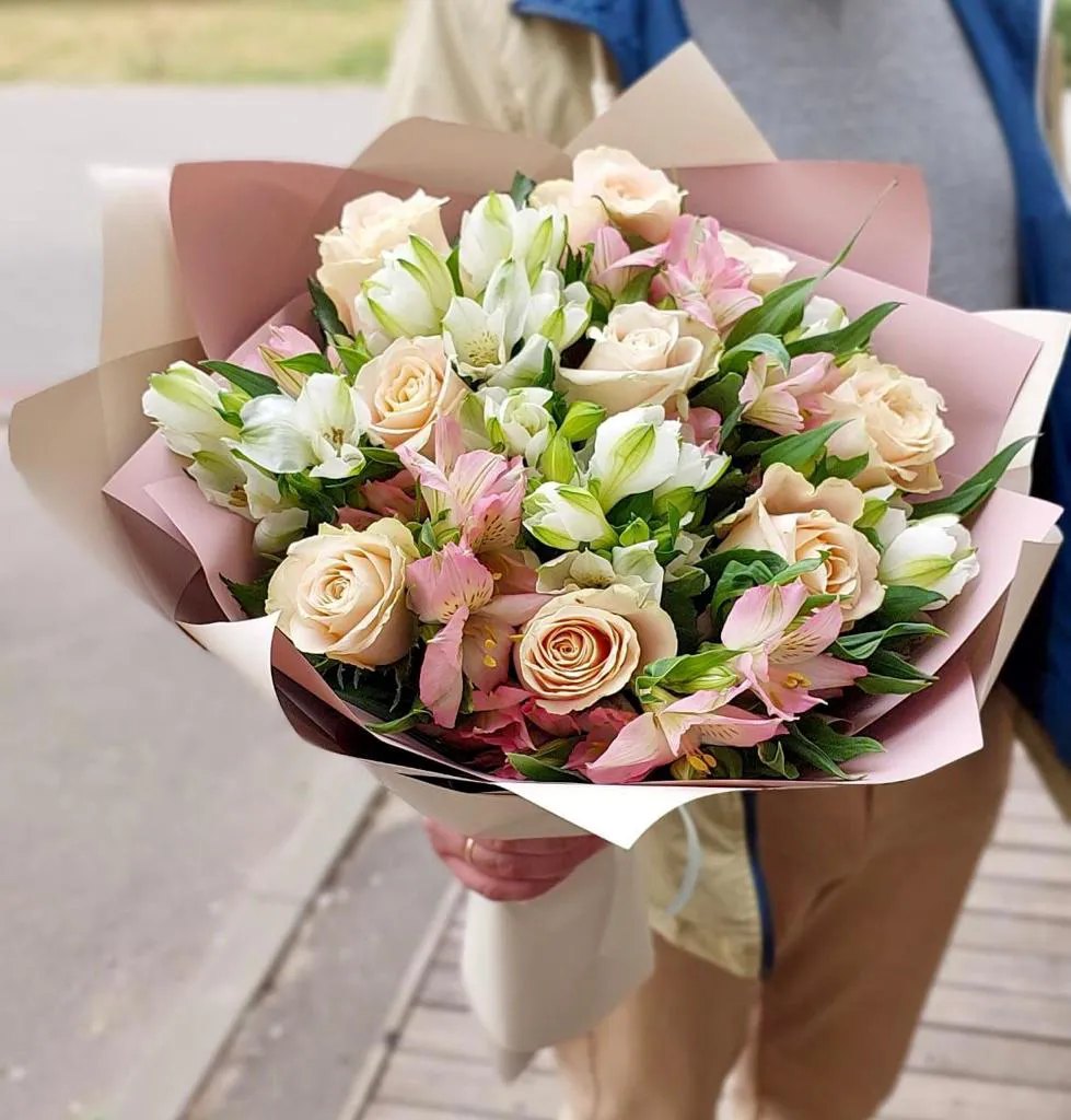 Состав букета: розы, альстромерии, зелень, упаковка, лента