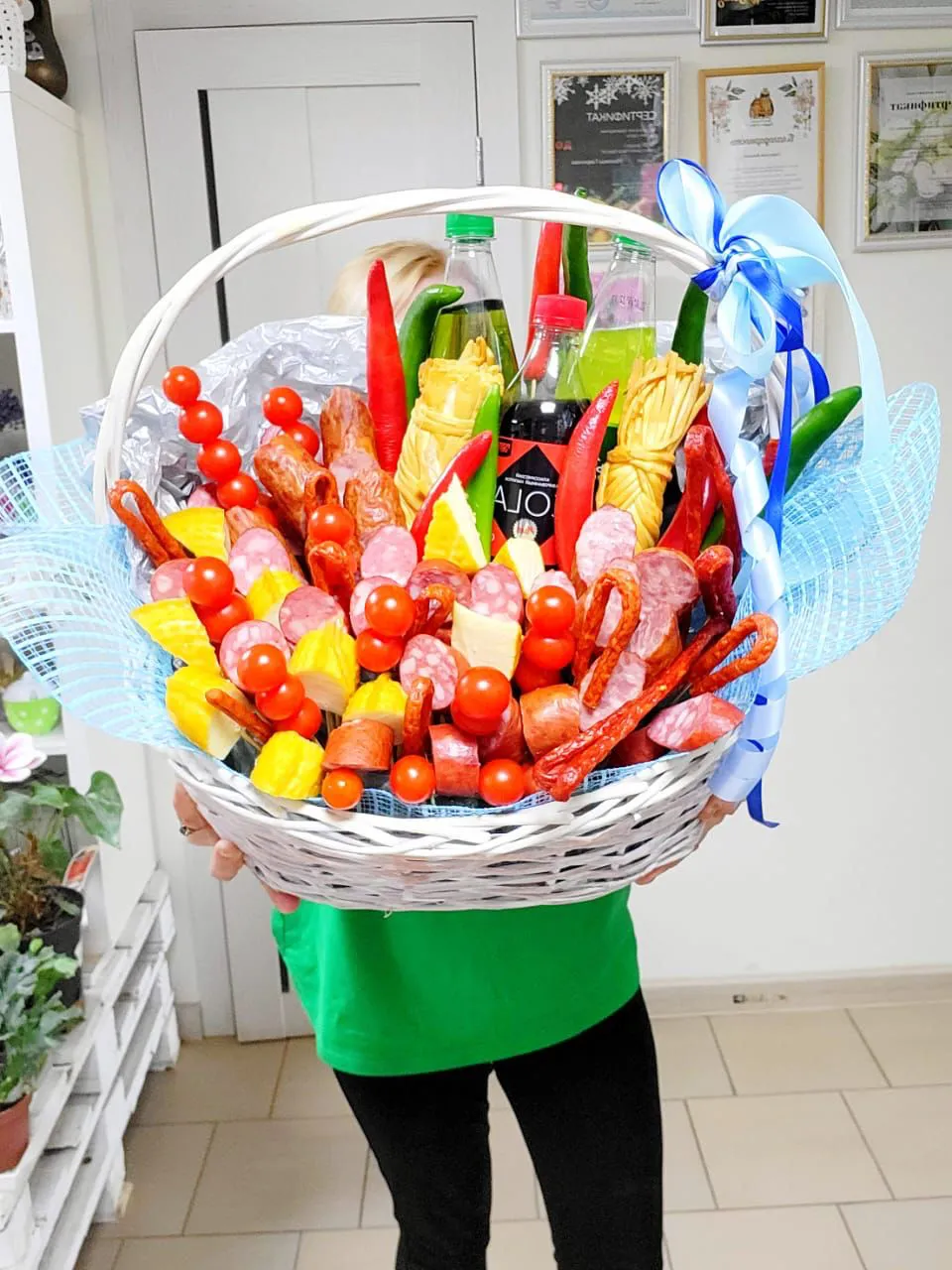 Состав: колбаса, хлеб, сыр, перец, черри, колбаски, корзина.