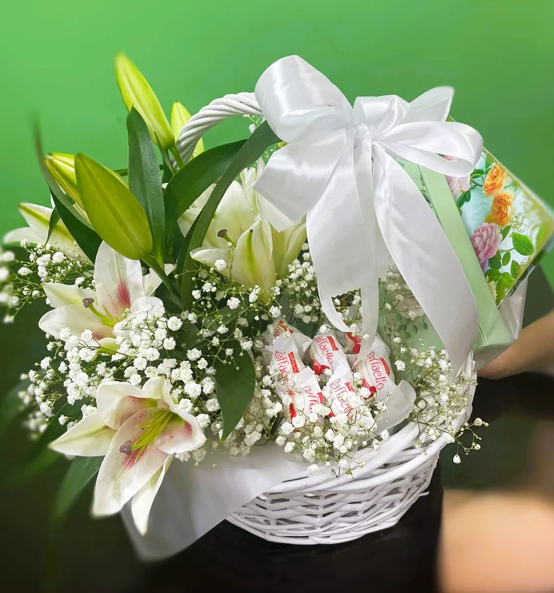 Эта корзина — истинное произведение искусства, где изящные лилии переплетаются с нежными соцветиями гипсофилы, создавая атмосферу лёгкости и утонченности. Их белоснежные лепестки словно обнимают сладости, аккуратно уложенные в корзину. Конфеты Рафаэлло добавляют нотки роскоши и сладости, а шоколадки с белым бантиком подчеркивают элегантность всего букета. Каждая деталь продумана, и эта композиция станет великолепным подарком для любого случая, далеким изящным акцентом, который не оставит равнодушным ни одного получателя. Погружая в атмосферу праздника и радости, эта корзина — символ нежности и заботы.