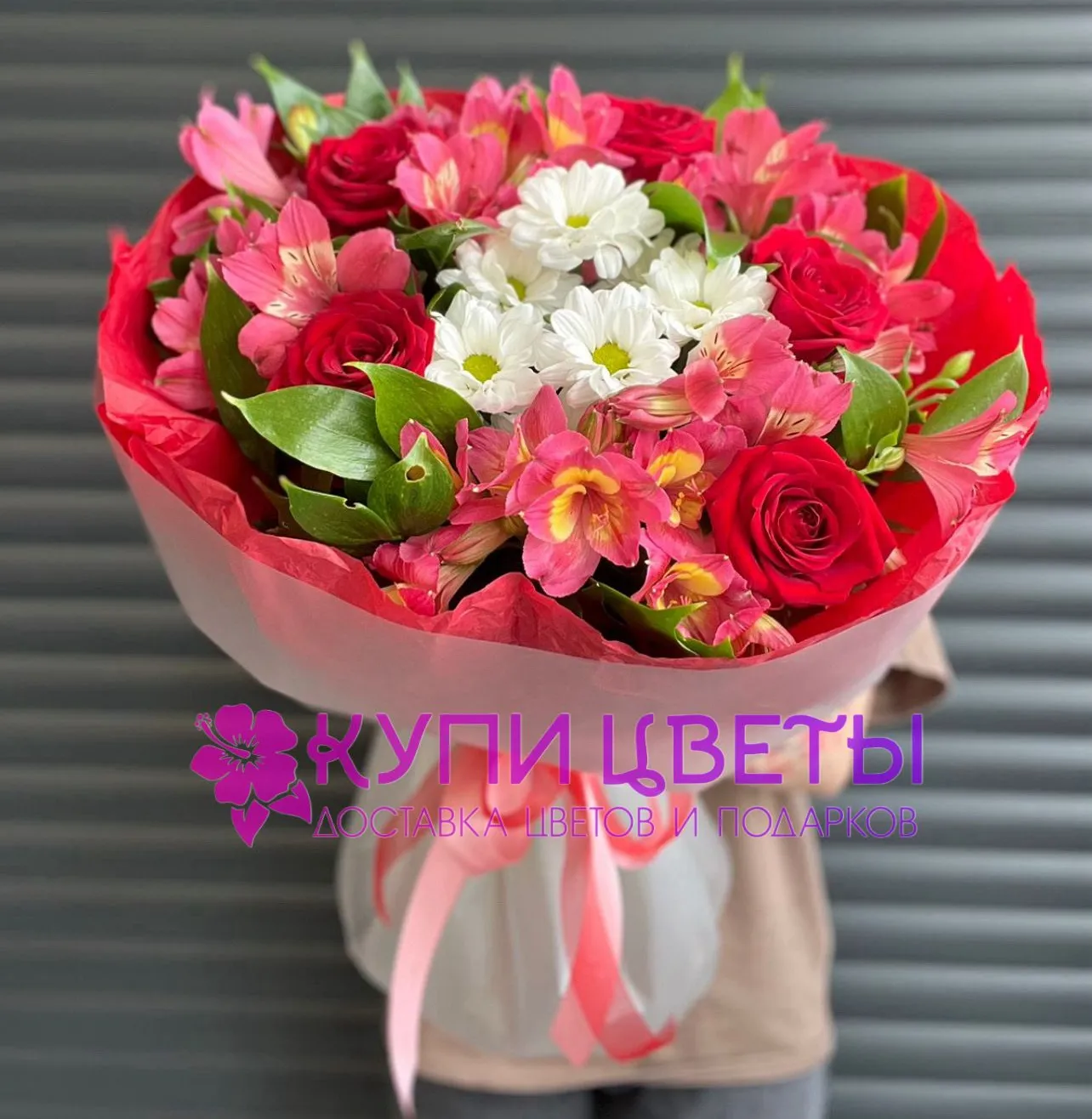 Вариант—Стандарт - роза - 3 шт., альстромерия - 4 шт., хризантема - 1 шт., зелень, упаковка, лента