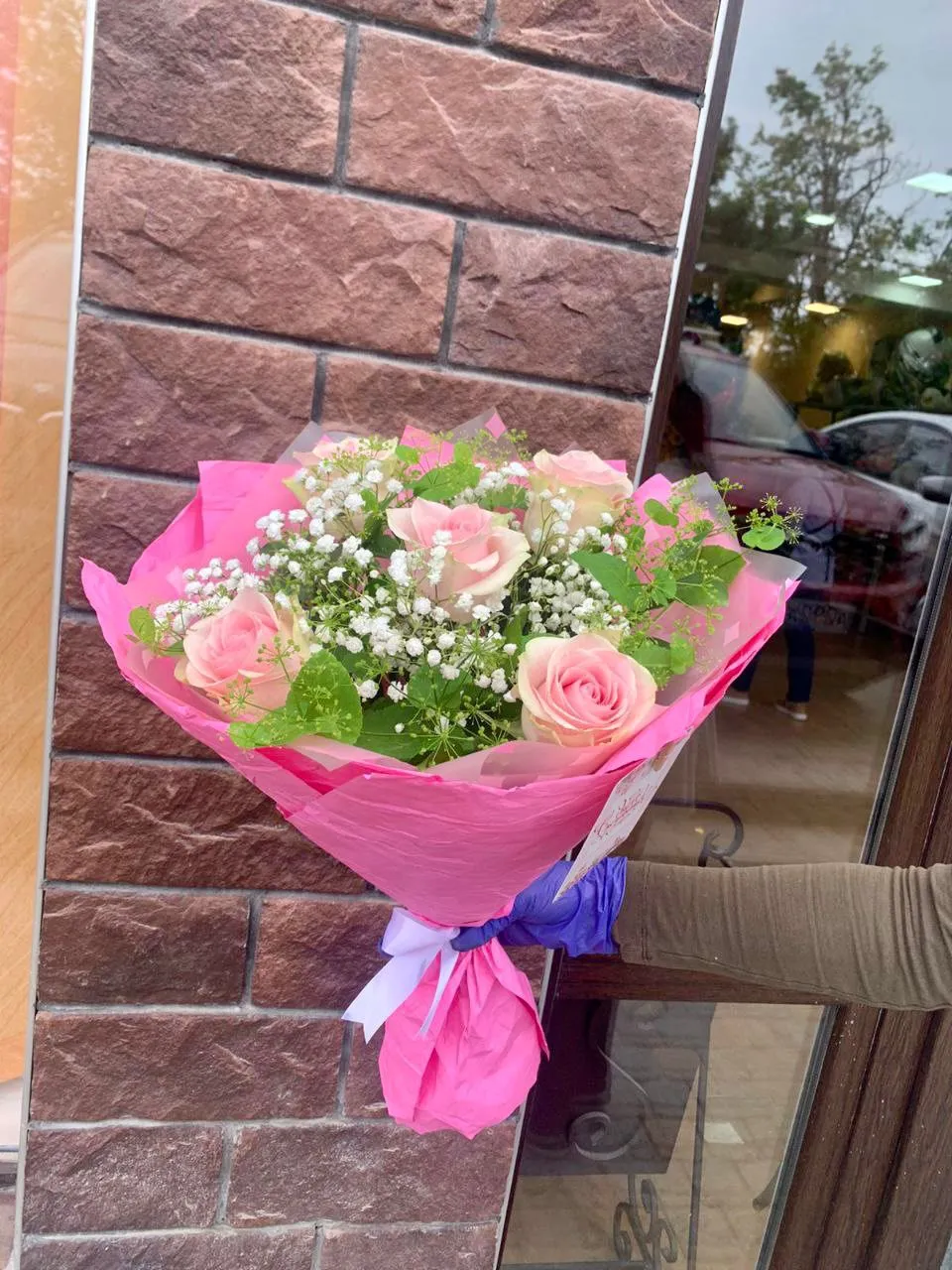 - Мини - роза - 5 шт., гипсофила, упаковка, лента