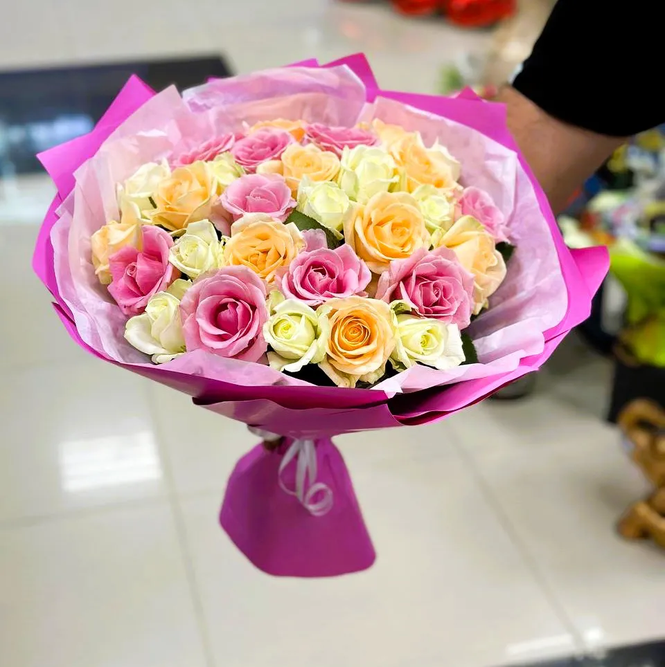 Чувственные розовые розы символизируют страсть и любовь, нежные розовые — трепет и заботу, а яркие желтые словно говорят о дружбе и радости. Белые розы, как символ чистоты и невинности, придают букету особую легкость и свежесть. Вместе они создают удивительное зрелище, где каждая деталь подчеркивает уникальность момента, в который дарится этот подарок.