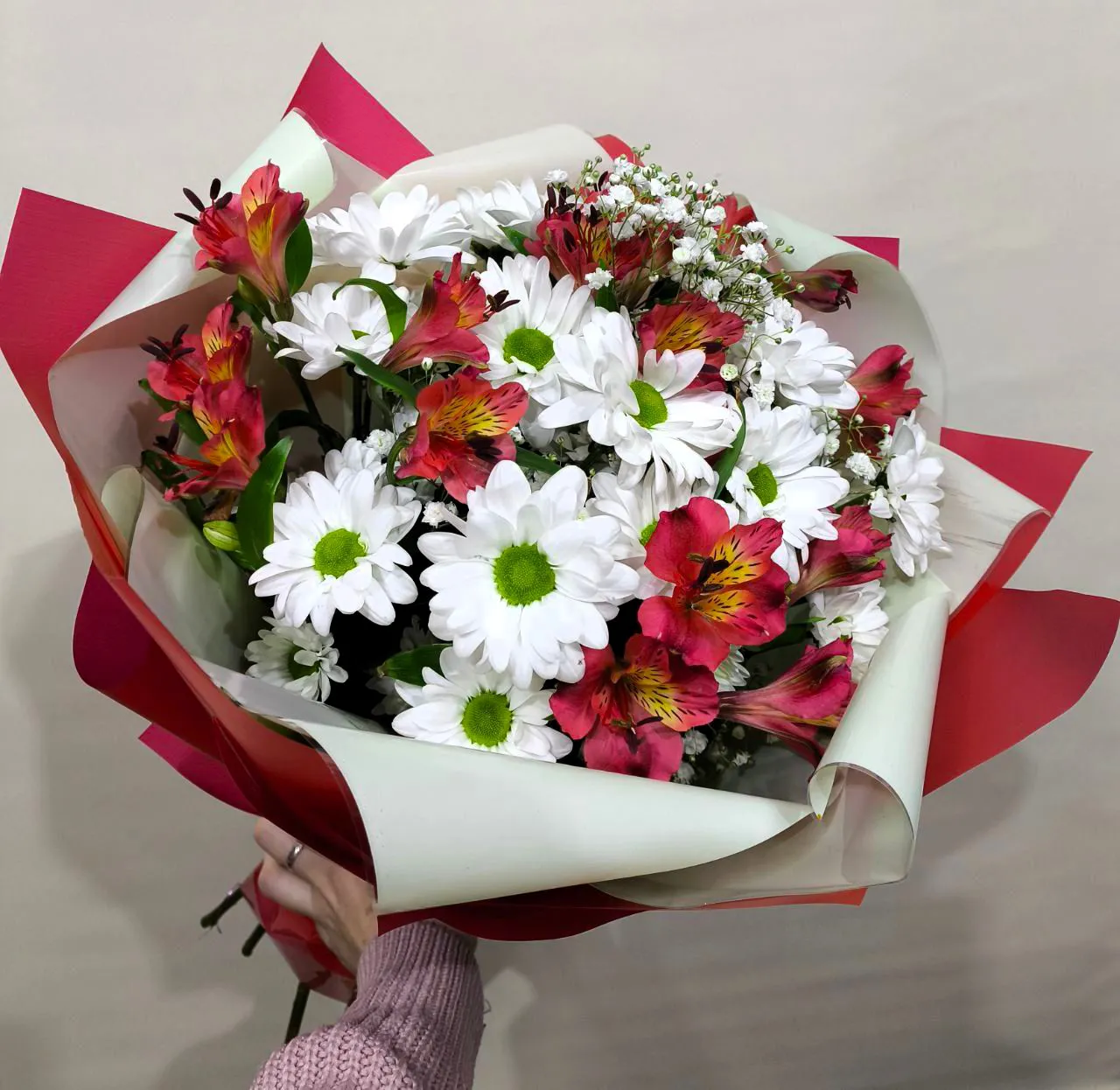 Альстромерии, кустовые хризантемы, упаковка, лента