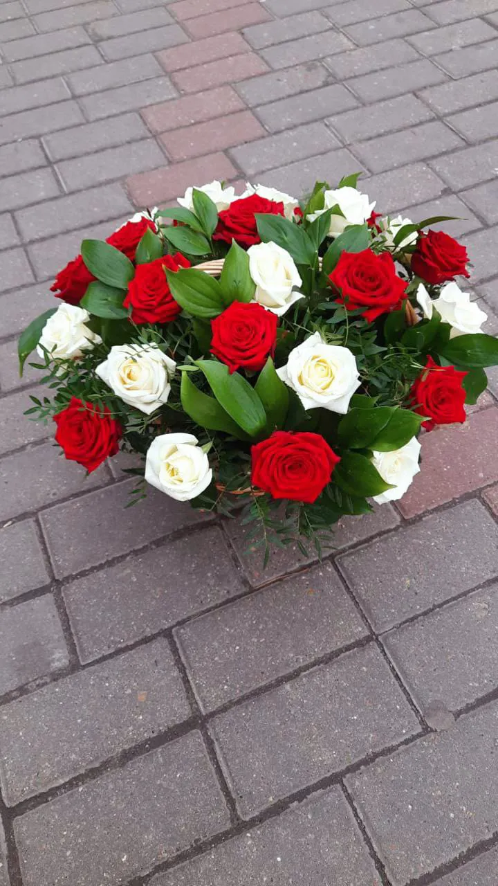 Красные и белые одноголовые розы, зелень, оазис, корзина |