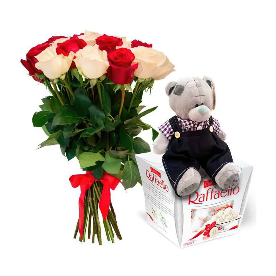 11 роз, мягкая игрушка 25 см и коробка Raffaello 150 гр.