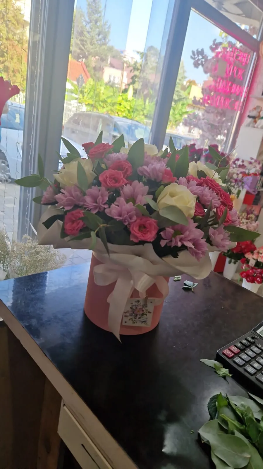 Эта шляпная коробка с белыми розами, кустовыми розами и фиолетовыми хризантемами станет замечательным подарком для любого повода, наполняя пространство атмосферой любви и гармонии.